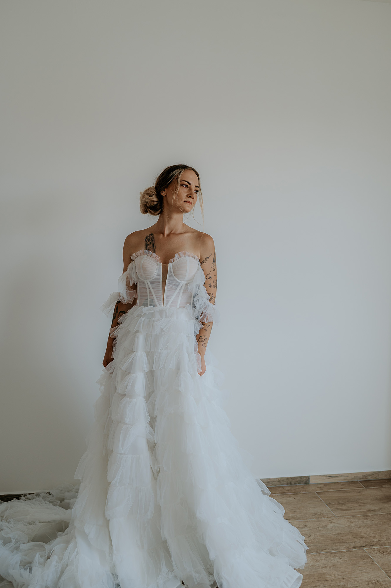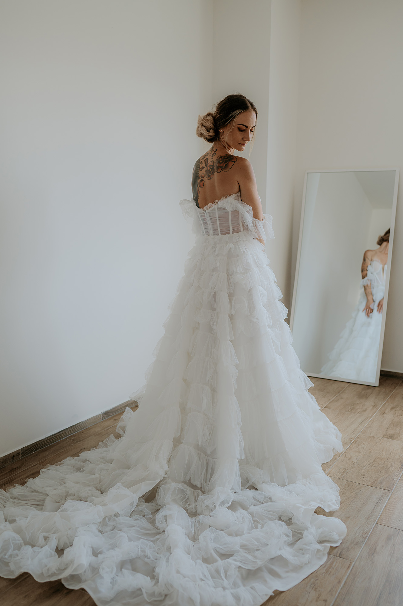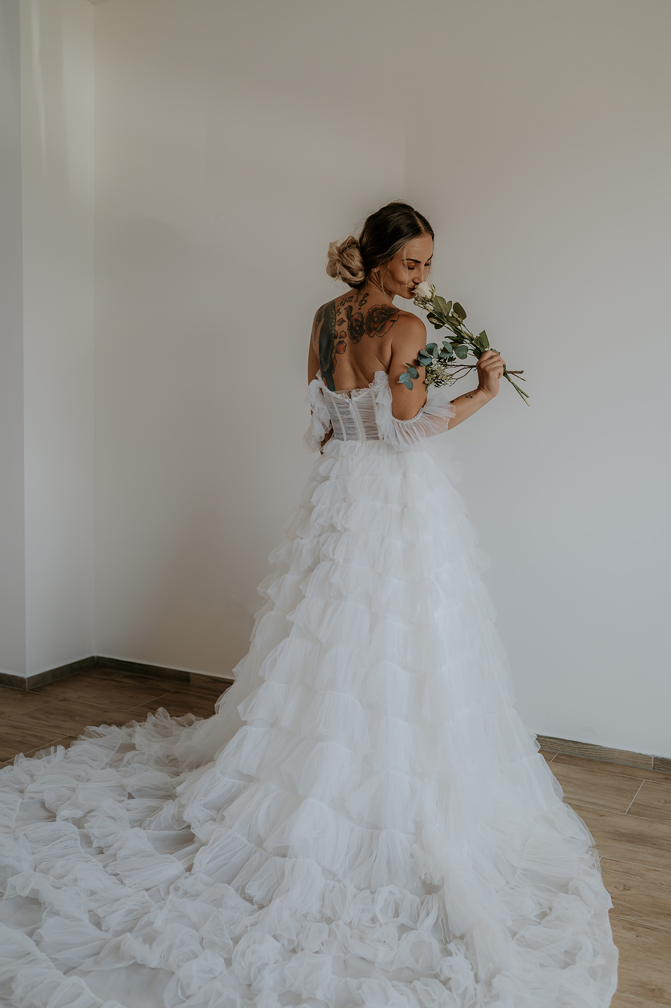 - zapínanie vzadu na zips - padavé neodnímateľné rukáviky - korzetový vystužený vrch bez šnurovačky - nádherná dlhá vlečka - farba: off-white - veľkosť 36