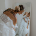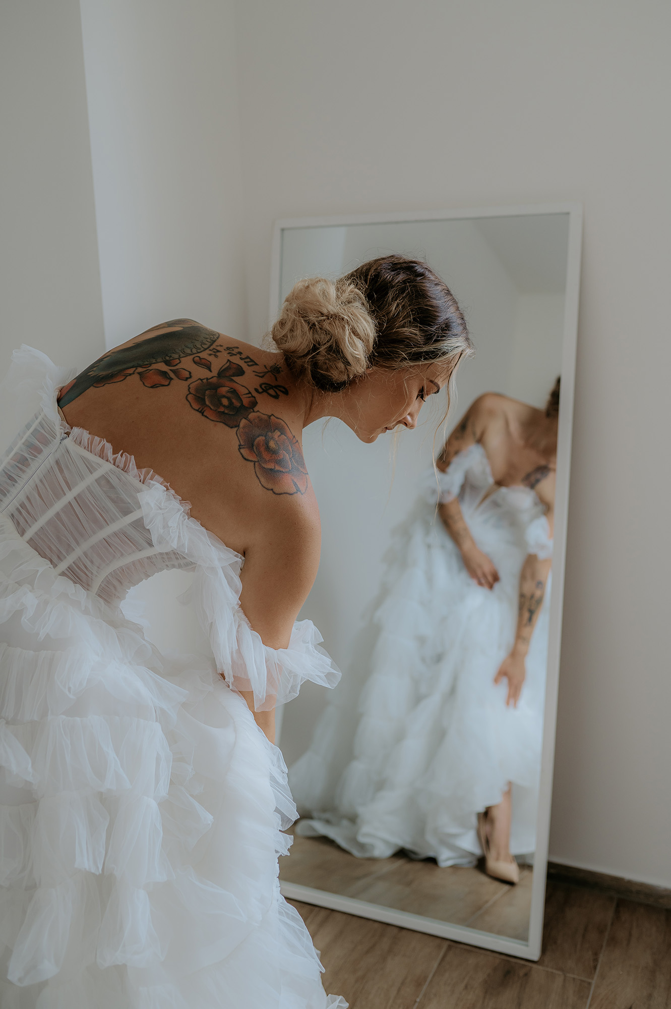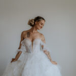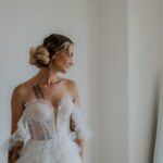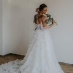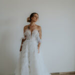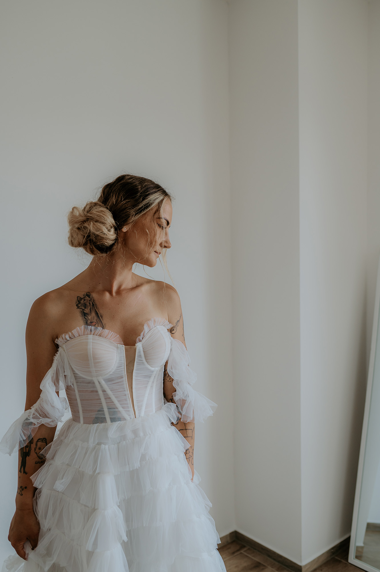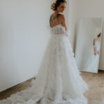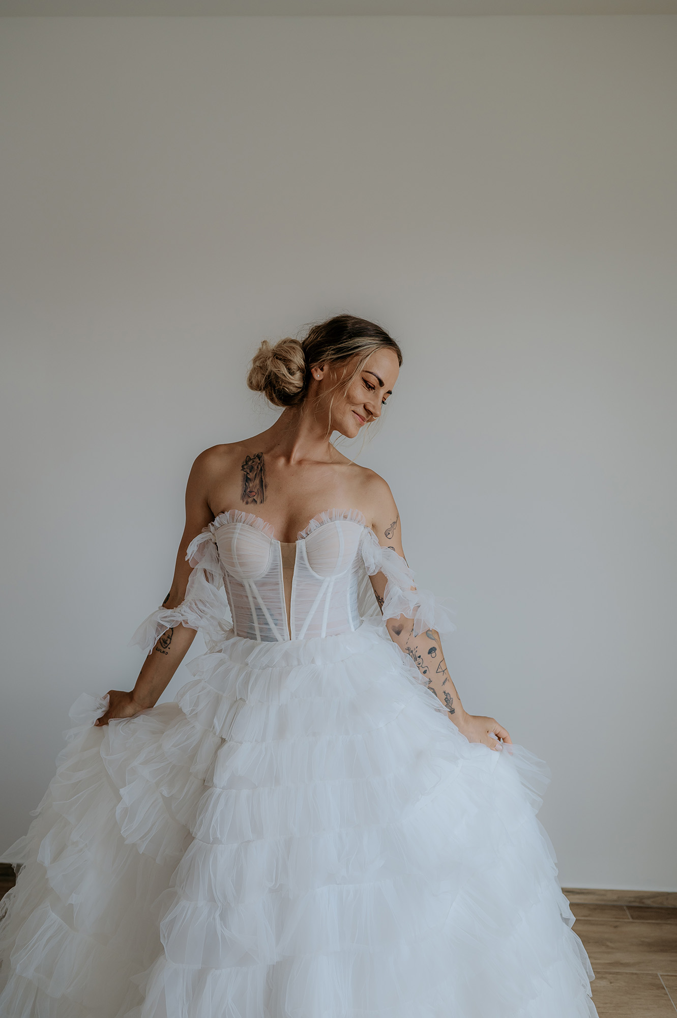 - zapínanie vzadu na zips - padavé neodnímateľné rukáviky - korzetový vystužený vrch bez šnurovačky - nádherná dlhá vlečka - farba: off-white - veľkosť 36