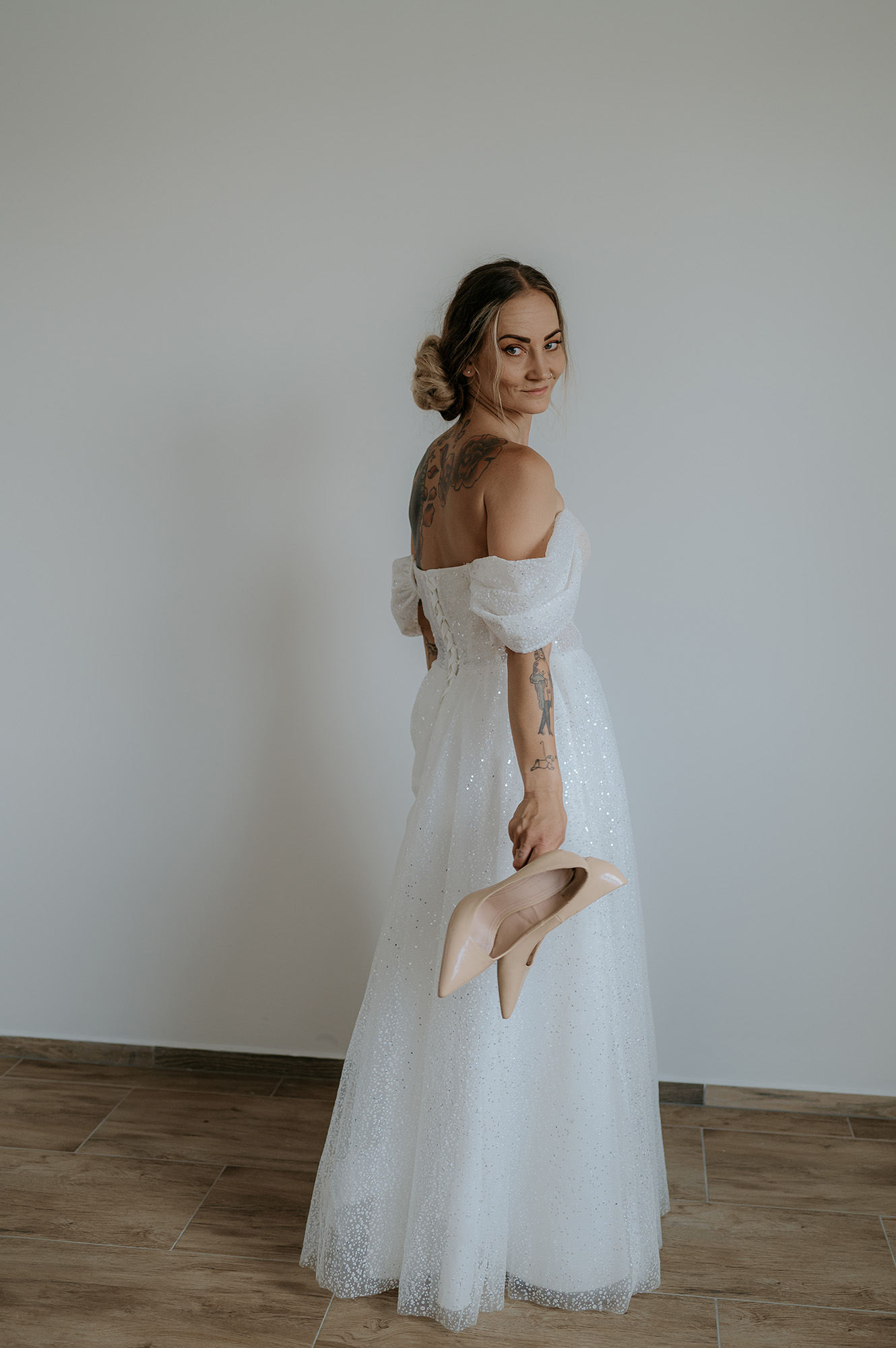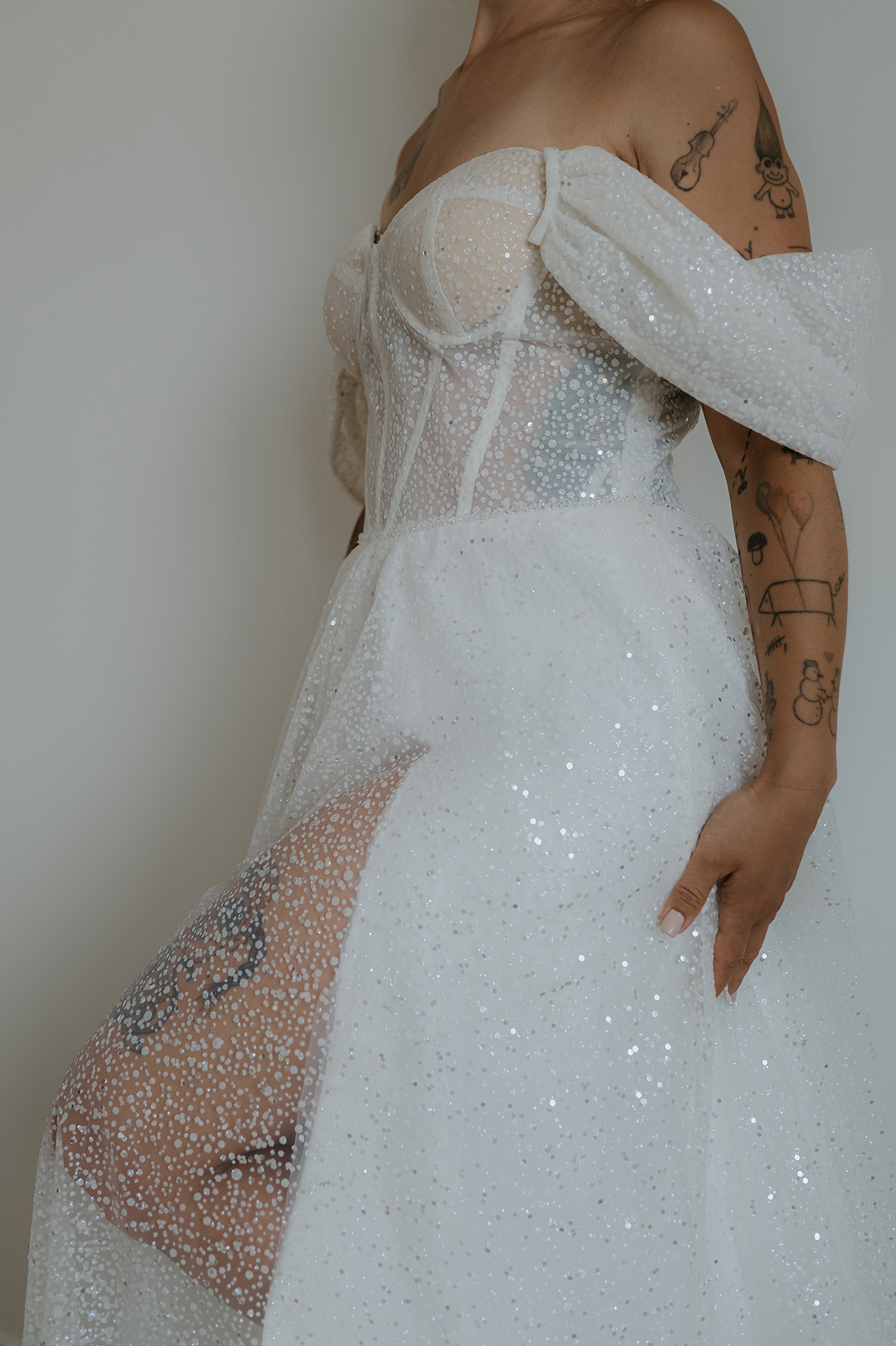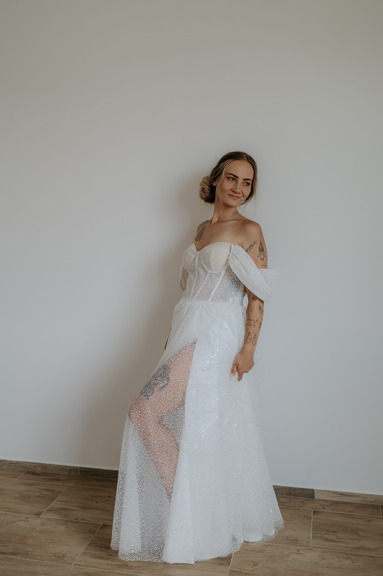 - zapínanie bez zipsu, iba na šnurovačku - korzet, rozparok a odnímateľné padavé ramienka - na nižšiu postavu cca 160 - 164 cm - výrazné trblietky - farba: off-white - veľkosť univerzálna 36 - 40