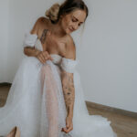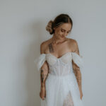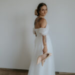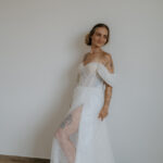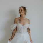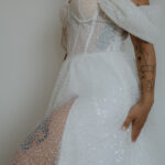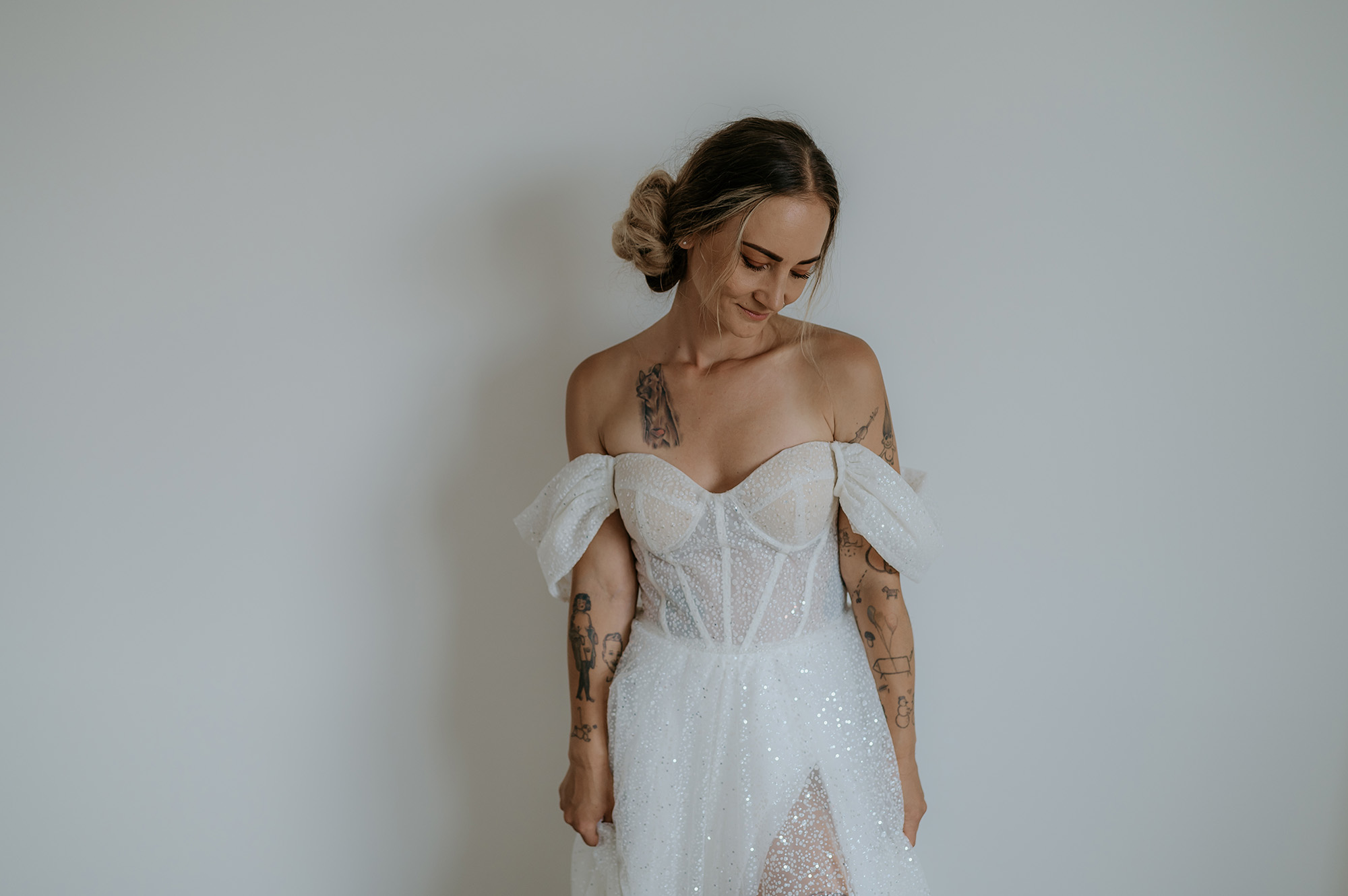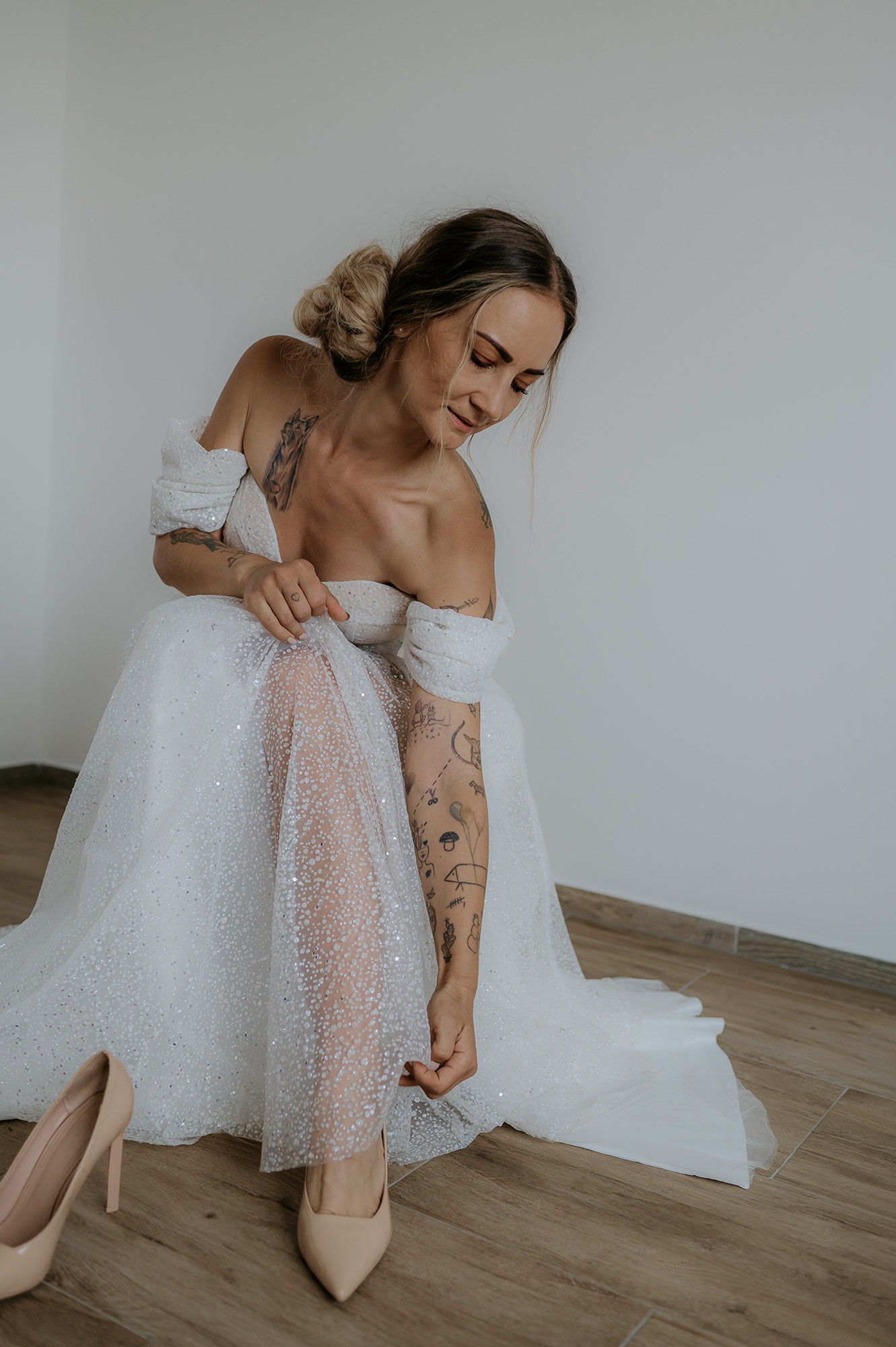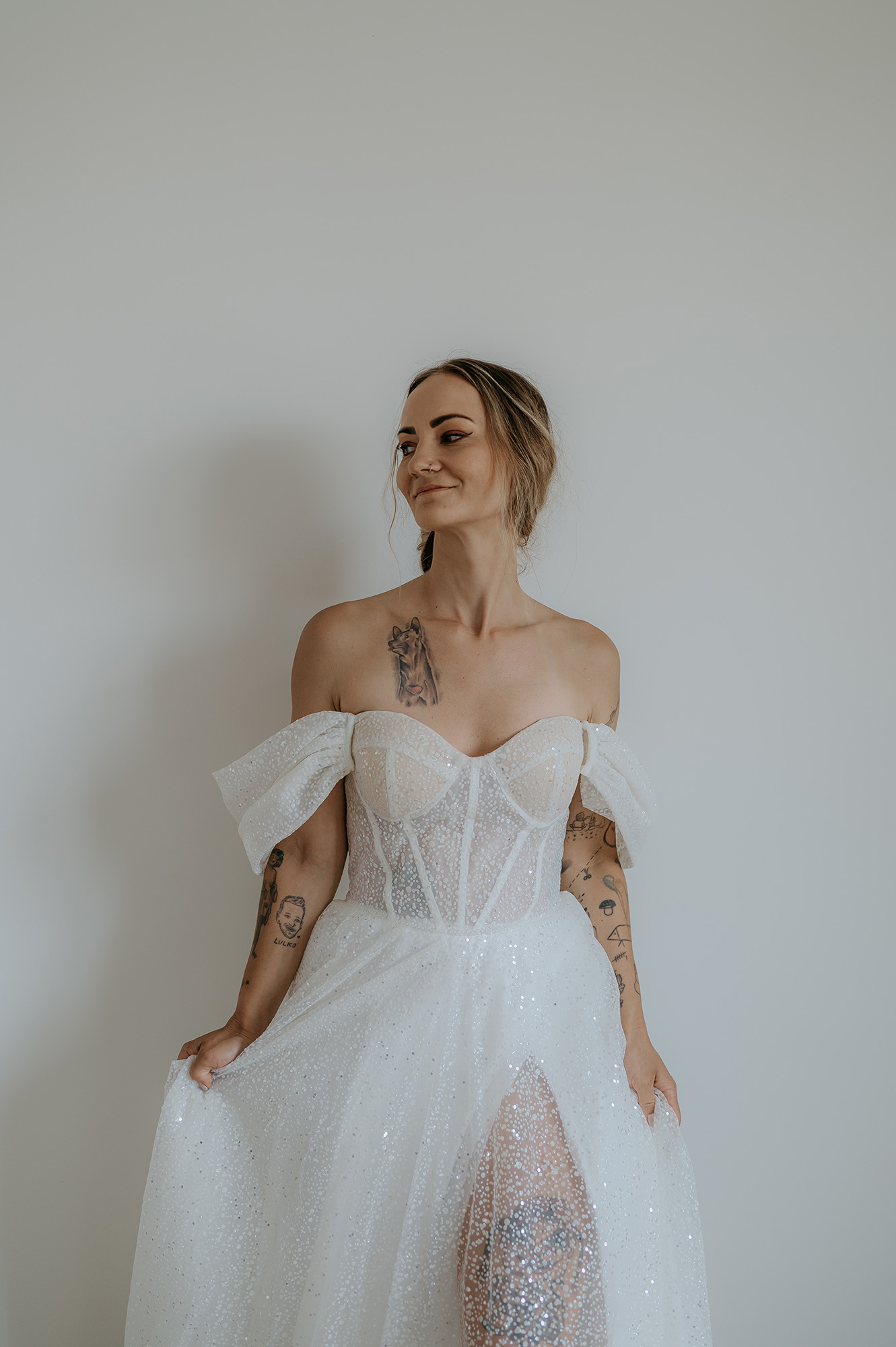 - zapínanie bez zipsu, iba na šnurovačku - korzet, rozparok a odnímateľné padavé ramienka - na nižšiu postavu cca 160 - 164 cm - výrazné trblietky - farba: off-white - veľkosť univerzálna 36 - 40