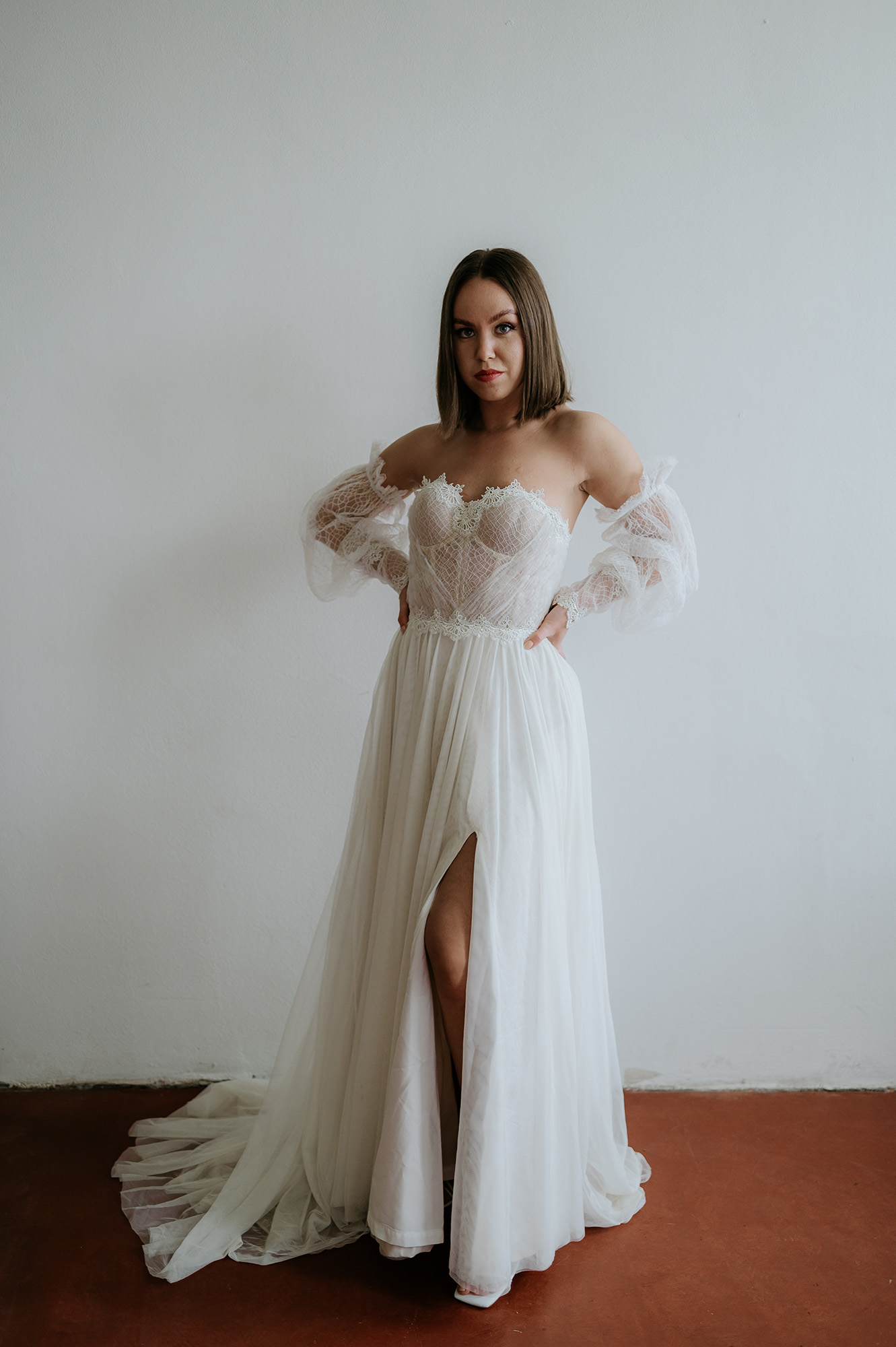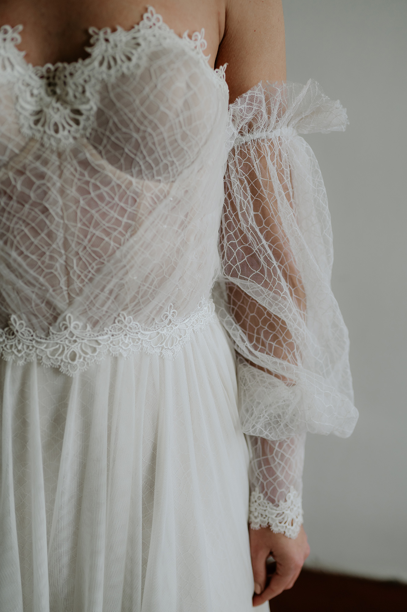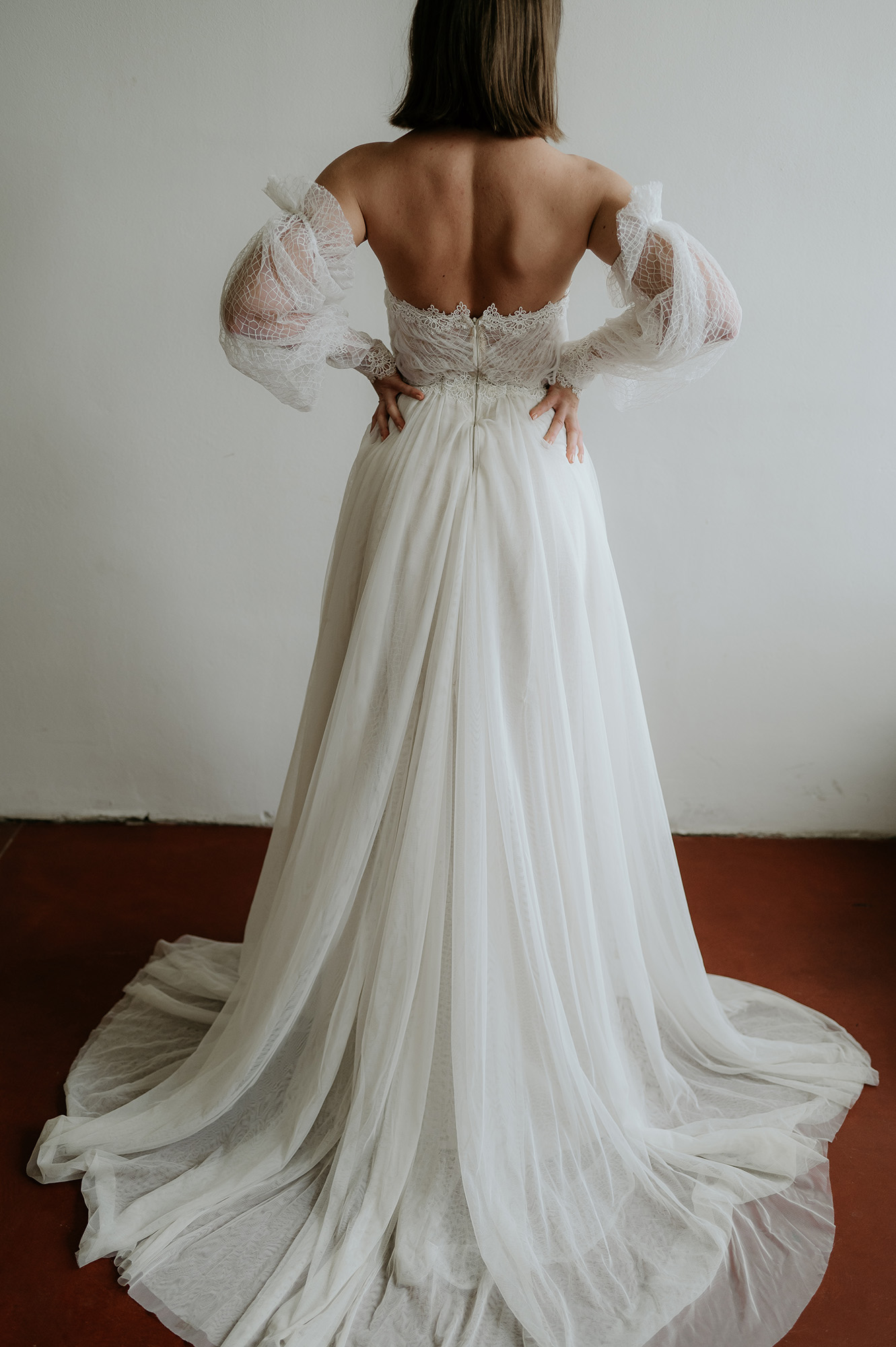 - zapínanie vzadu na zips - korzetový top - nezvyčajný vzor a krásna krajka - odnímateľné rukávy, šaty je teda možné nosiť dvoma spôsobmi - decentný rozparok - farba: ivory - veľkosť 32-34, alebo veľmi malá 36
