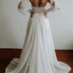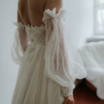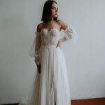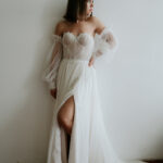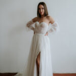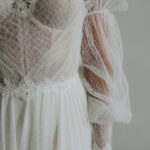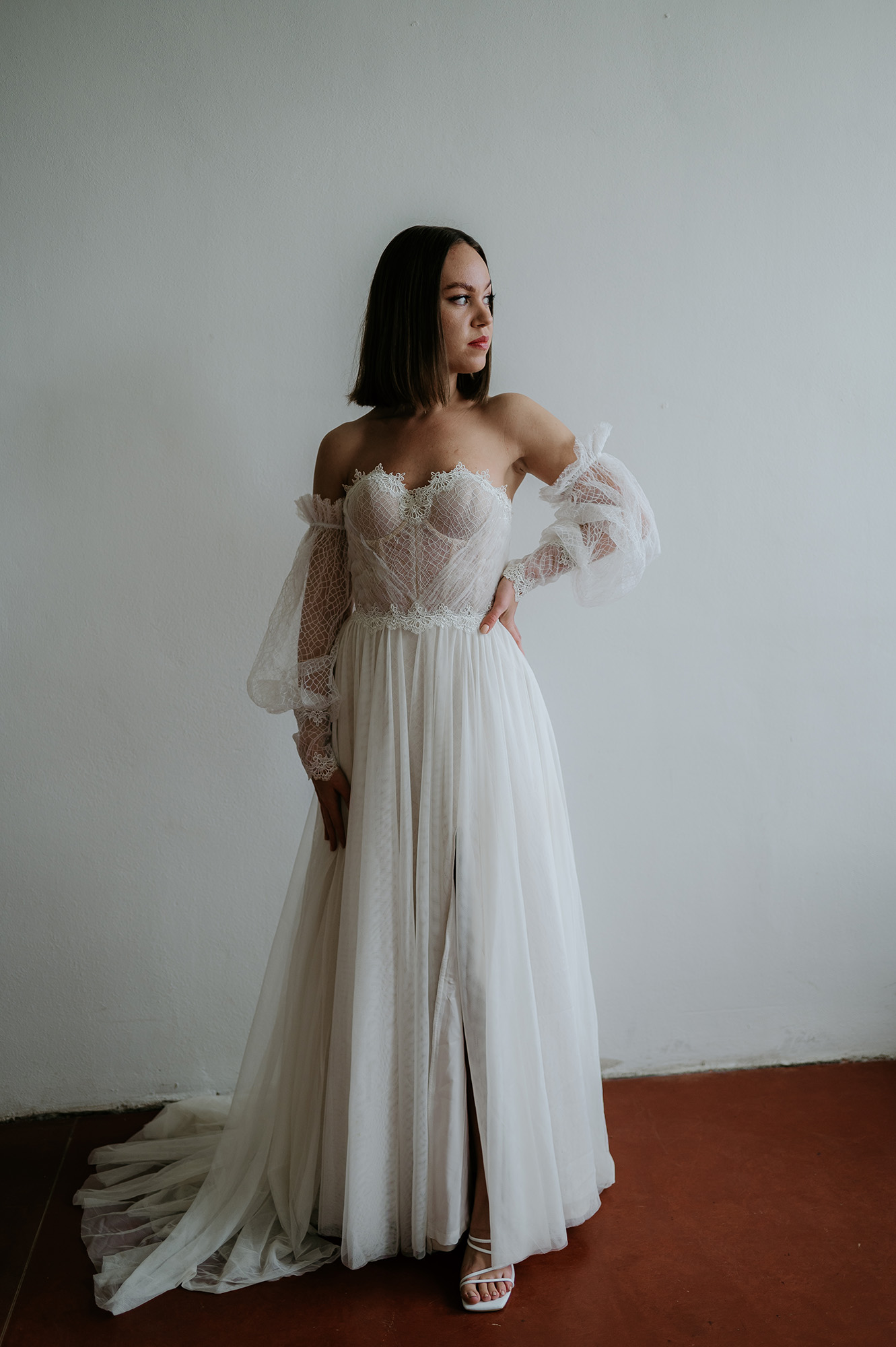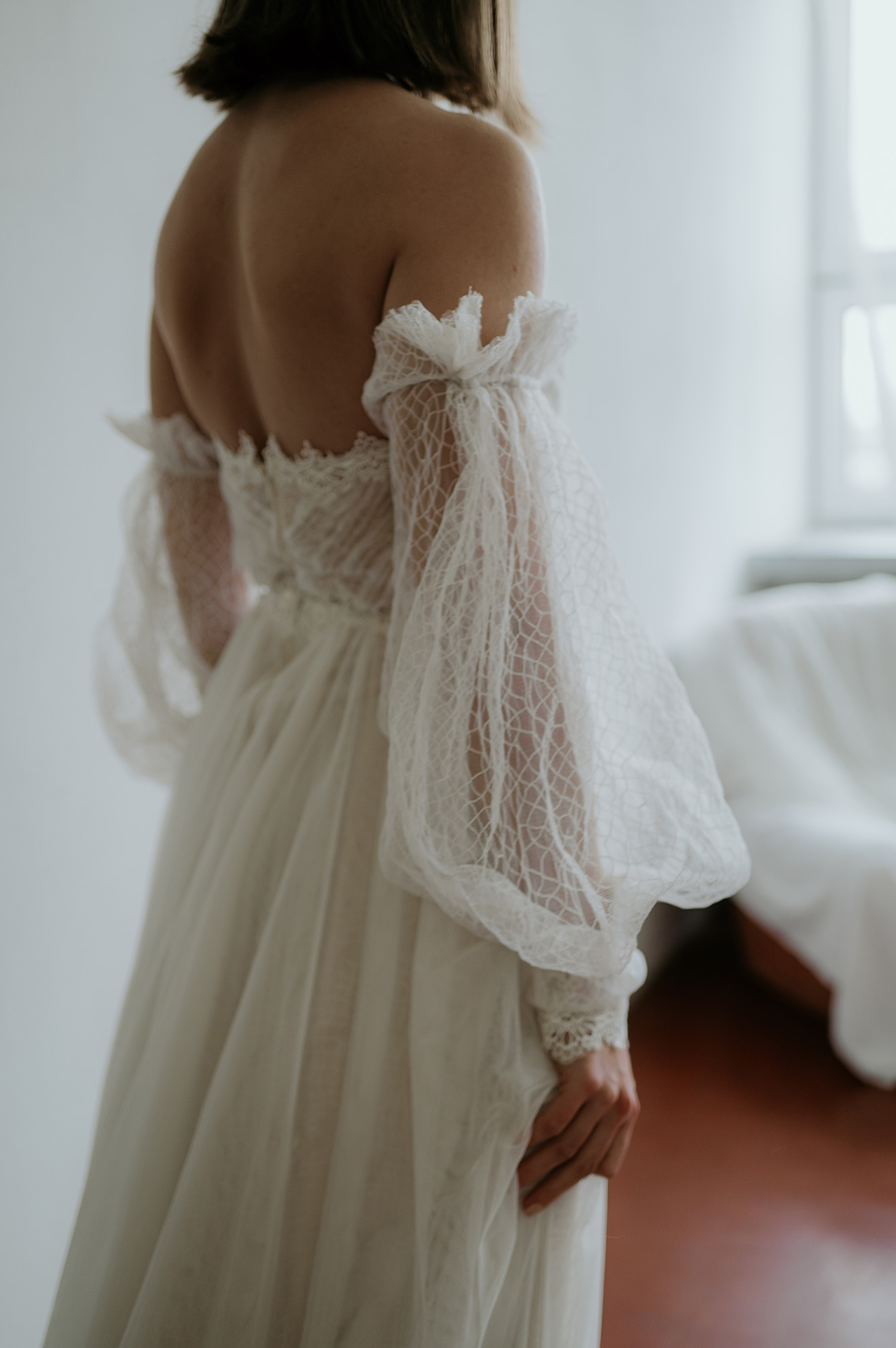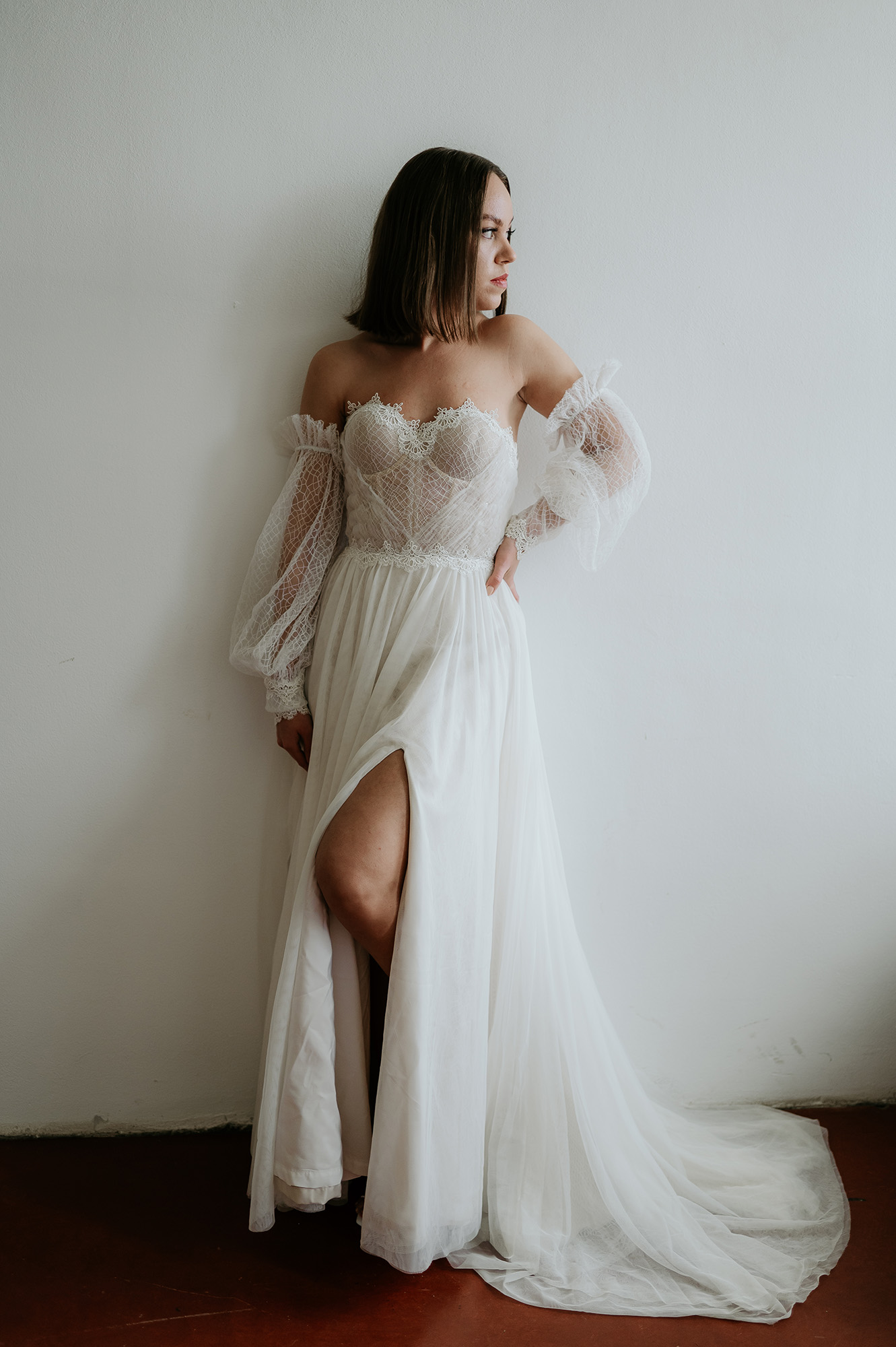 - zapínanie vzadu na zips - korzetový top - nezvyčajný vzor a krásna krajka - odnímateľné rukávy, šaty je teda možné nosiť dvoma spôsobmi - decentný rozparok - farba: ivory - veľkosť 32-34, alebo veľmi malá 36