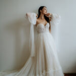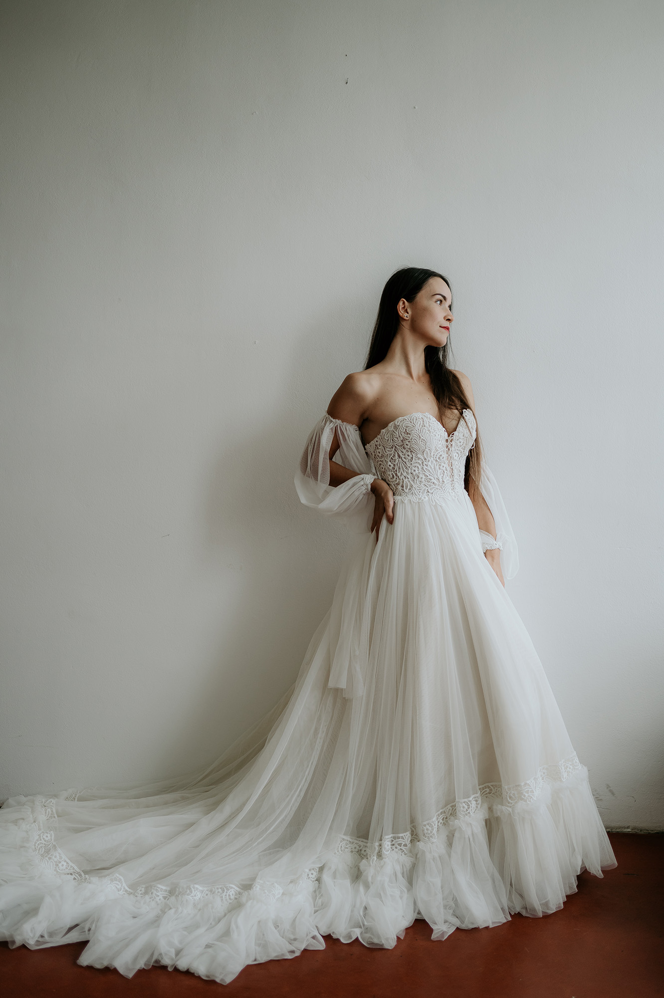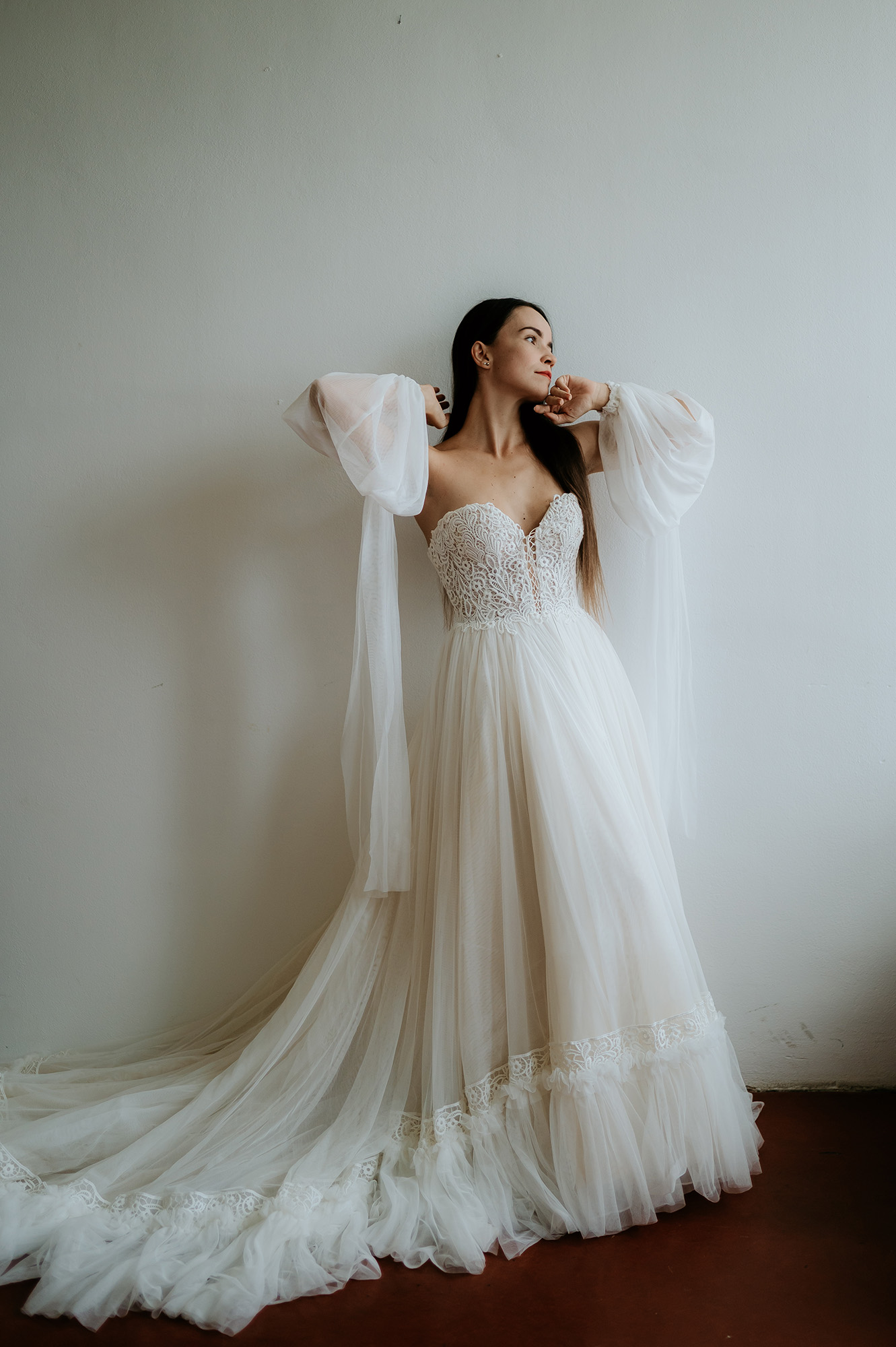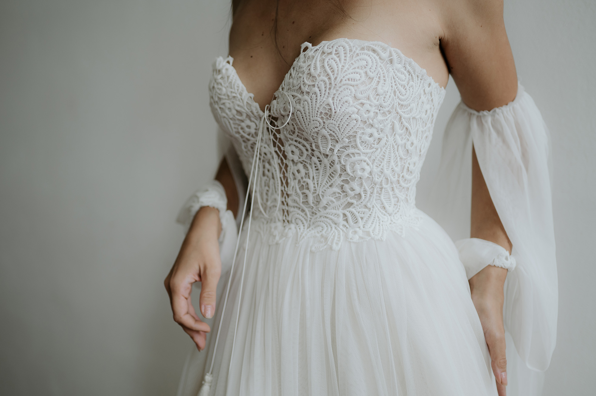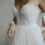 - zapínanie vzadu na zips + šnurovací korzet - ozdobný šnurovací korzet vpredu - rukávy na navliekanie, dá sa nosiť s nimi aj bez nich - výrazná, bohatá, neprehliadnuteľná vlečka - vhodné na plnšie poprsie - farba: ivory - veľkosť: 32-34