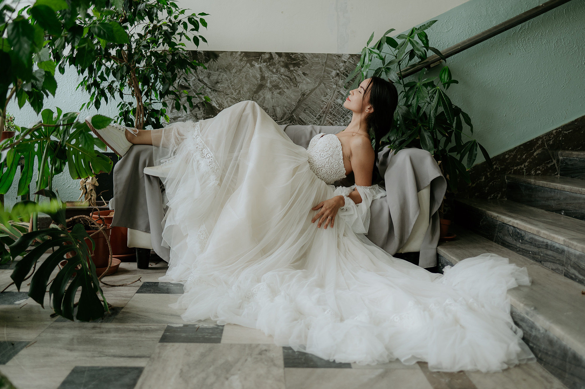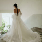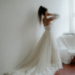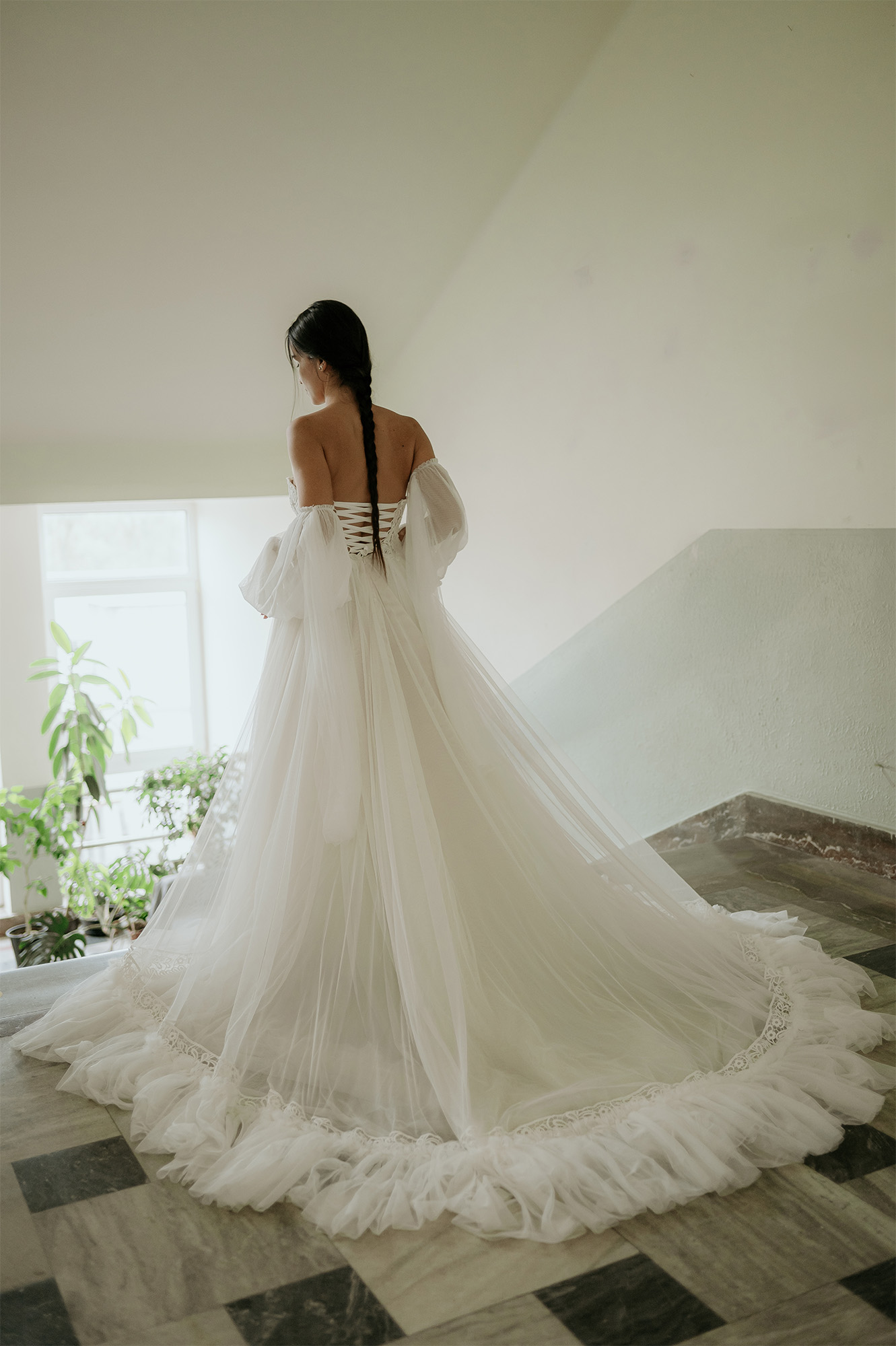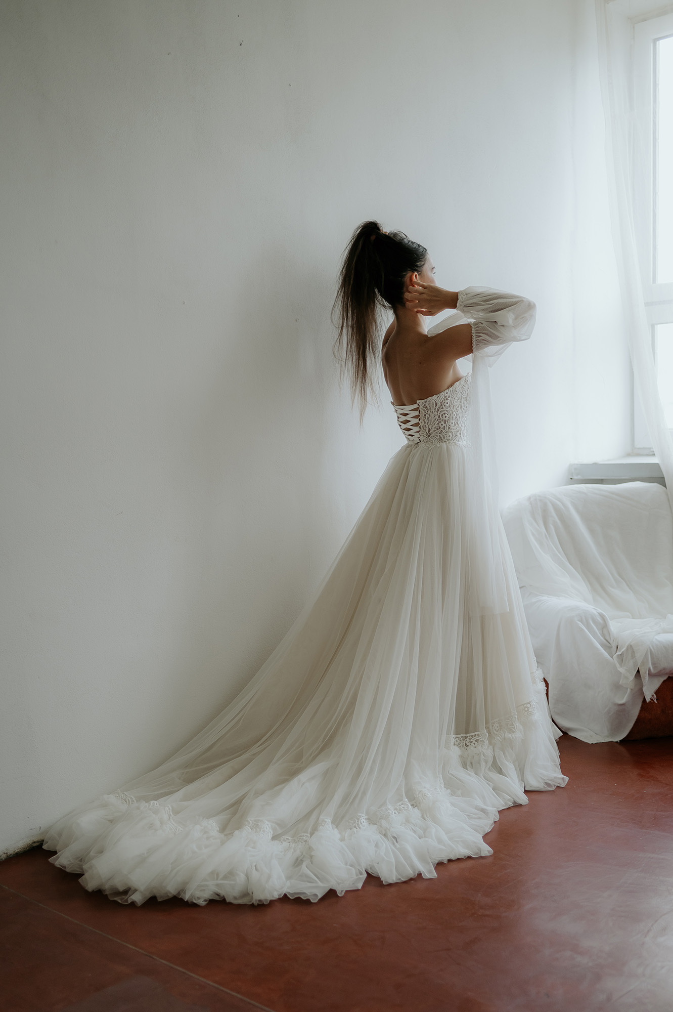 - zapínanie vzadu na zips + šnurovací korzet - ozdobný šnurovací korzet vpredu - rukávy na navliekanie, dá sa nosiť s nimi aj bez nich - výrazná, bohatá, neprehliadnuteľná vlečka - vhodné na plnšie poprsie - farba: ivory - veľkosť: 32-34