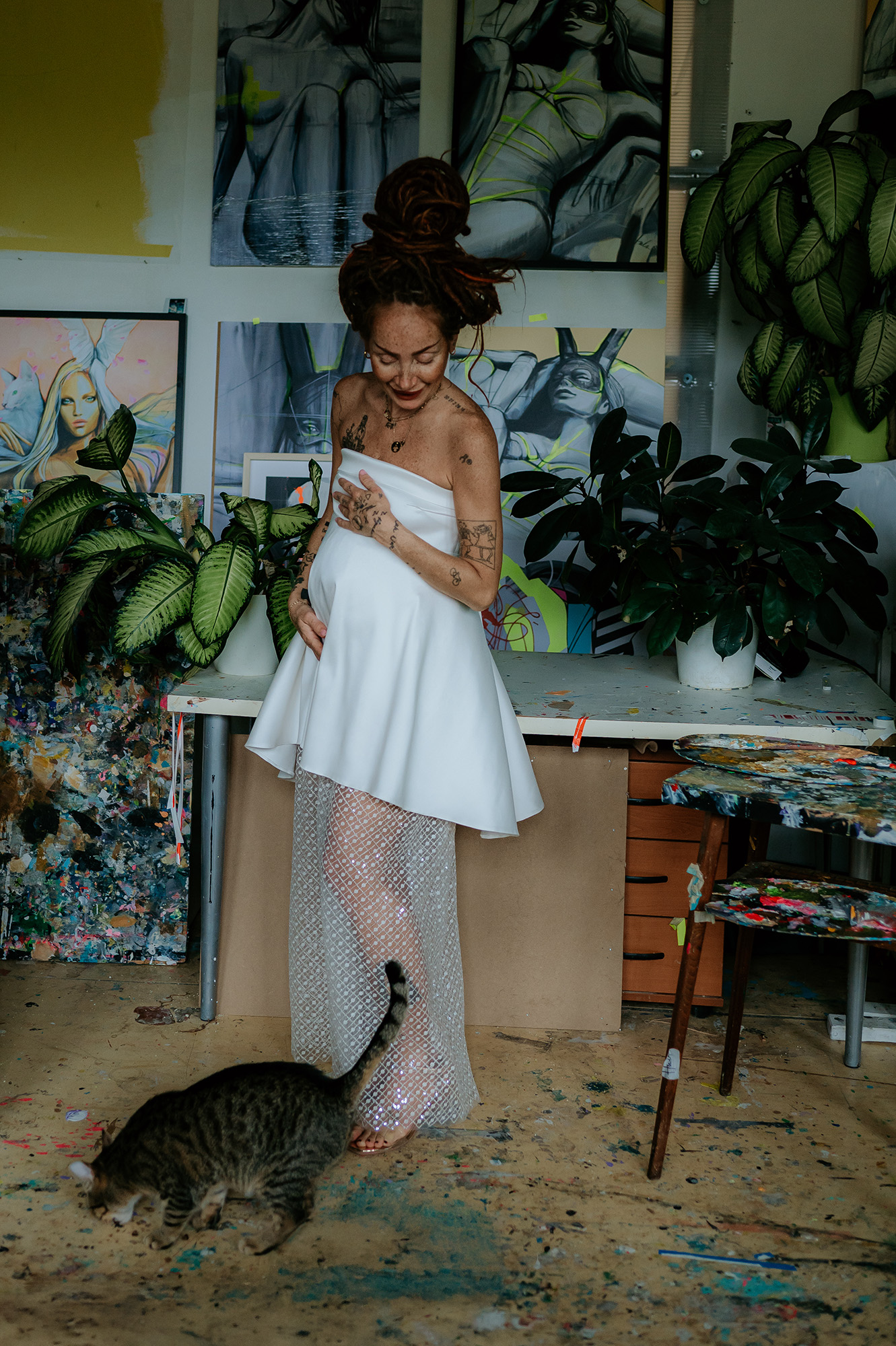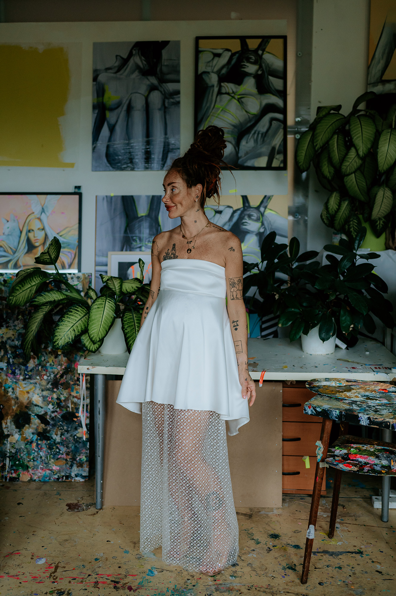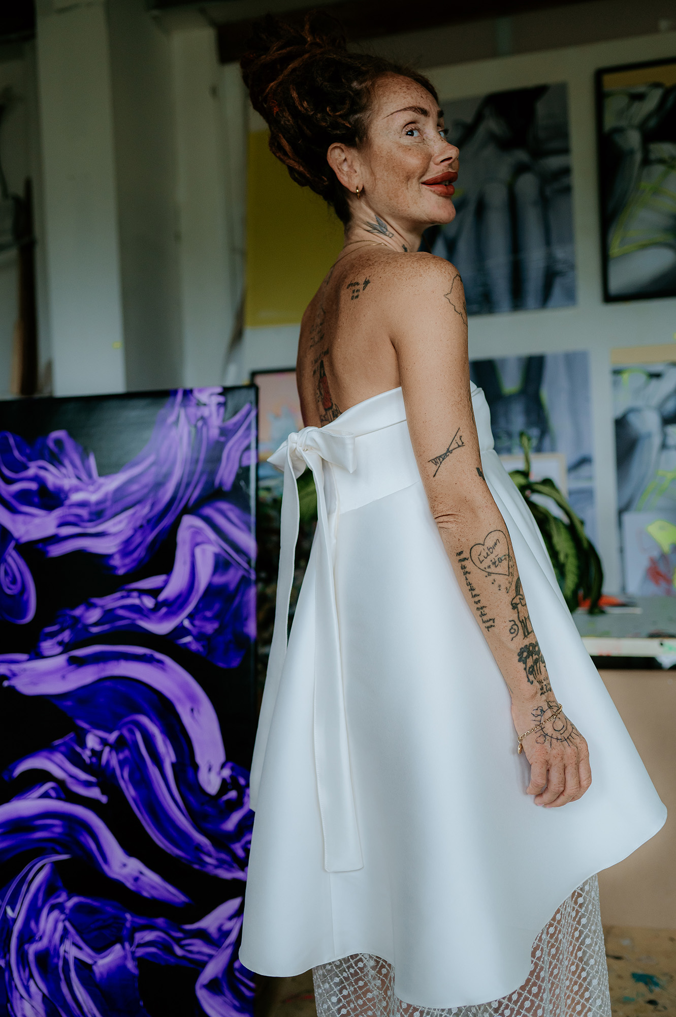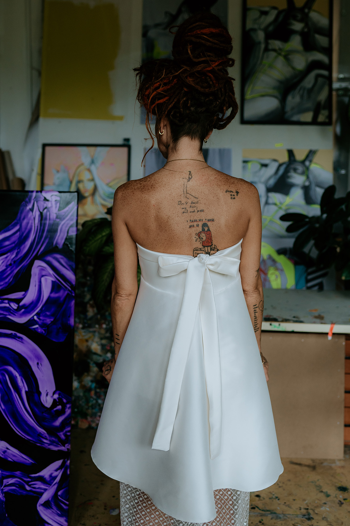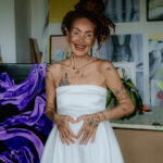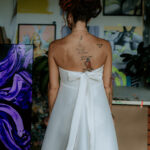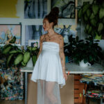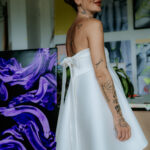 - zapínanie vzadu na zips - výrazná mašlička - bez ramienok - lesknúce sa flitre v dolnej časti šiat - netypická spodná časť šiat - vhodné ako klasické, ale aj tehotenské - farba: off-white - veľkosť: 34-36
